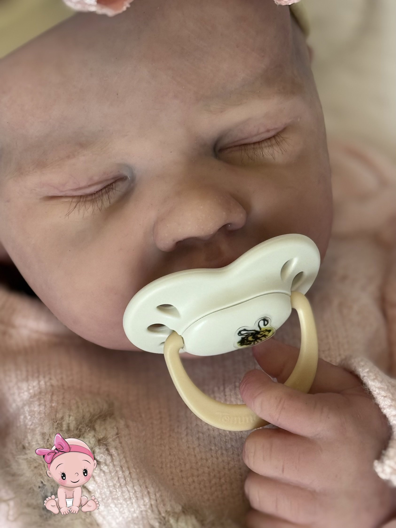She has an open mouth with tongue and can take a full size pacifier. She has armatures to pose her into lifelike positions. Her silicone feels soft and has a memory foam feel. I have never felt a more real sculpt! Don’t miss out on this rare opportunity to own one of Joanna’s miraculous creations!